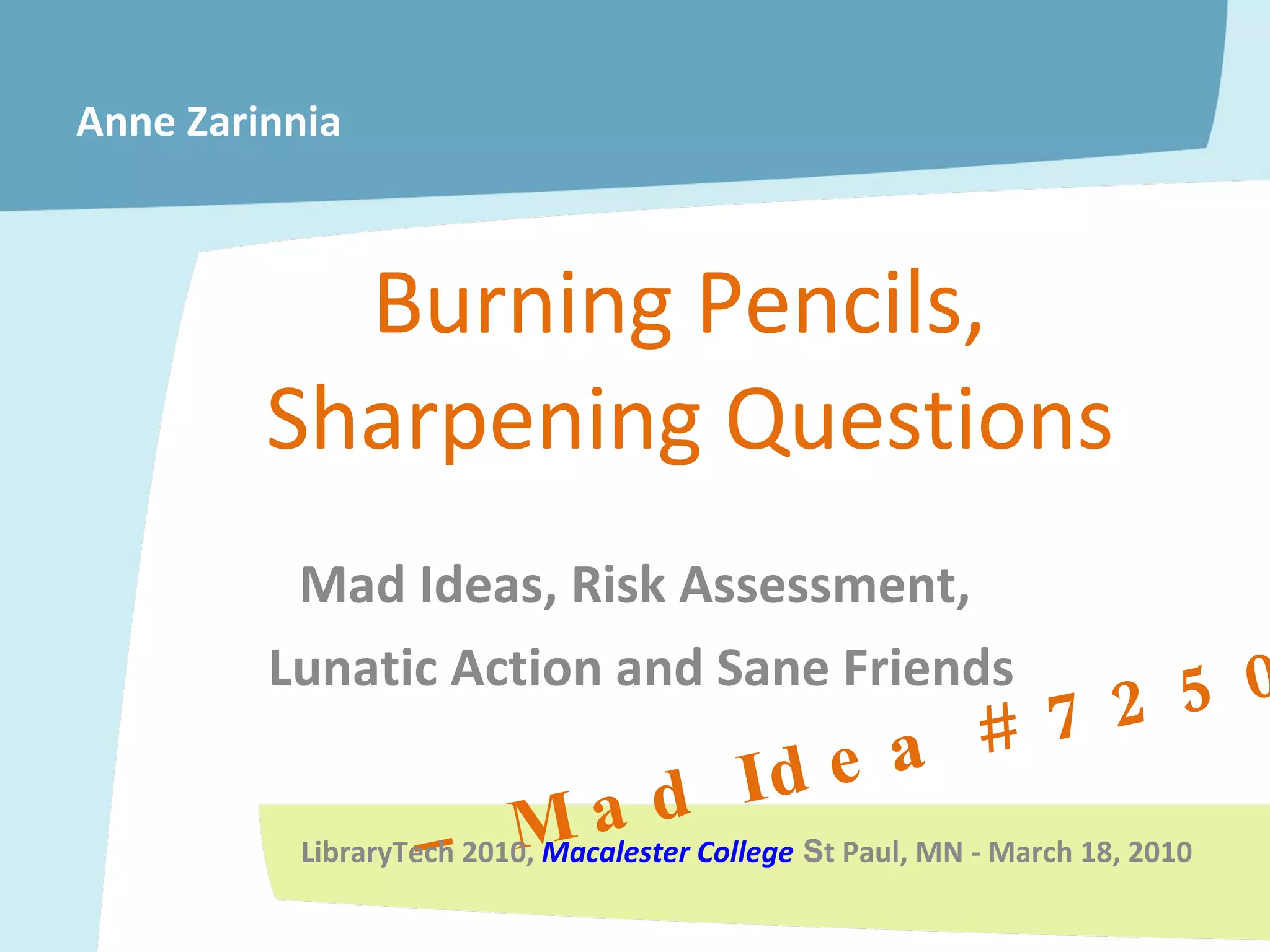 The document discusses several "mad ideas" related to education, including creating a virtual department to educate students, focusing on student outcomes like creativity and problem solving, and allowing children to learn independently through open access to the internet without direct teaching. It also references projects like "holes in the wall" that showed children in India could learn on their own this way. The overall theme is that the current education system is outdated and new, "mad" ideas are needed to transform and improve it.