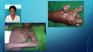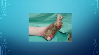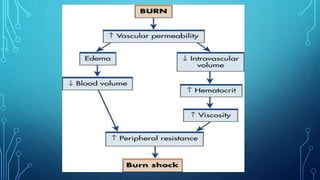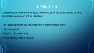 This document provides an overview of different types of burns, including thermal, chemical, electrical, and frostbite. It discusses burn classification based on depth, extent, location, and patient risk factors. The depth of burn is categorized as partial thickness (superficial or deep) or full thickness. Extent is measured using the Lund-Browder chart or rule of nines. Burn management involves three phases - emergent/resuscitative, acute wound healing, and rehabilitative - with the initial focus on resolving life-threatening problems in the first 24-48 hours.