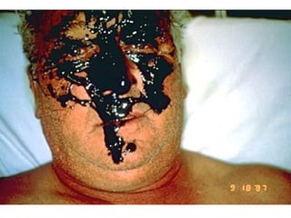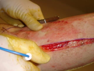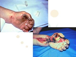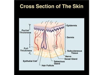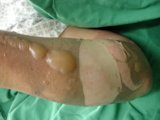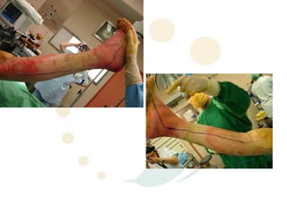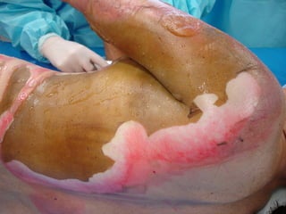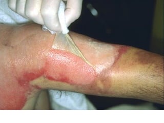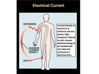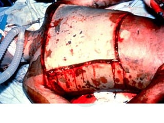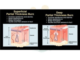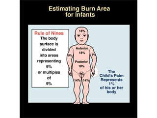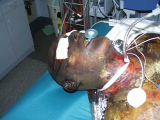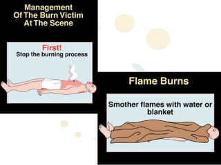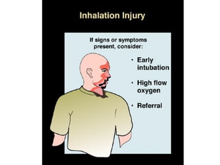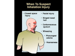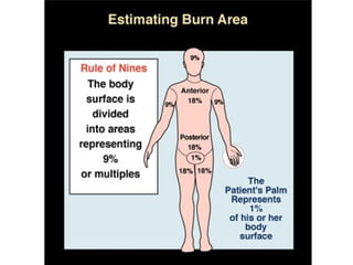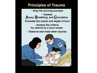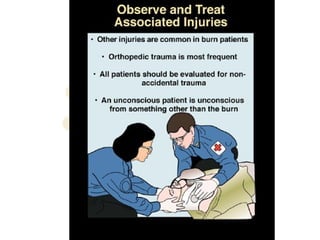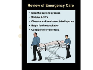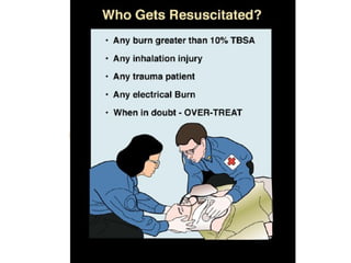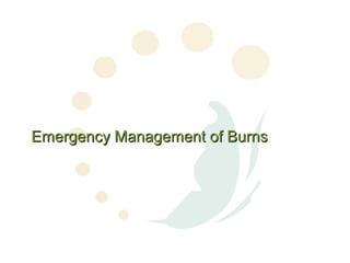 The document discusses emergency management of burns. It provides information on common causes of burns, pathophysiology involving initial and secondary tissue damage, burn wound classification models, and initial management following the EMSB (airway, breathing, circulation, disability, exposure, fluids) protocol. Key points include fluid resuscitation using the Parkland formula, monitoring for signs of circulatory obstruction in limbs, considering escharotomy if needed, and criteria for burn patient transfer to a specialized burn unit.
