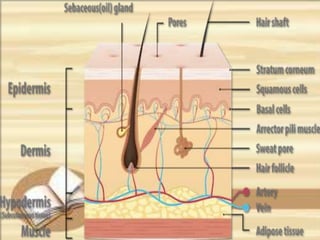 1. The structure of skin and how burns damage the epidermis and dermis layers.