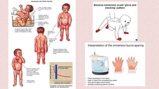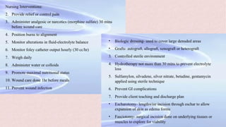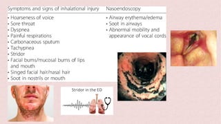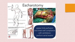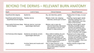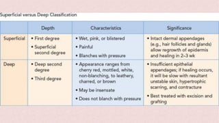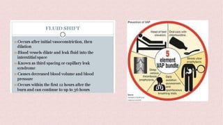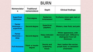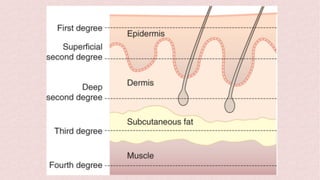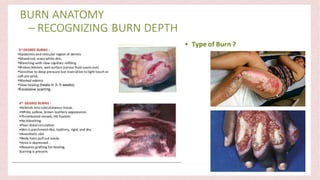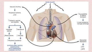 Burns can cause devastating physical and emotional effects. Classification is based on depth of skin damage from 1st to 4th degree. Severe burns increase risks of infections, loss of mobility, and multi-organ damage. Treatment involves stabilizing fluid and electrolyte shifts, administering IV fluids based on burn size, and preventing complications like shock, hypothermia, and infections. Patients with severe or complex burns may require referral to a specialized burn center.