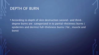 1) Depth and extent of burns are classified using tools like the Lund-Browder chart to determine severity. Location of burns can impact respiratory function.