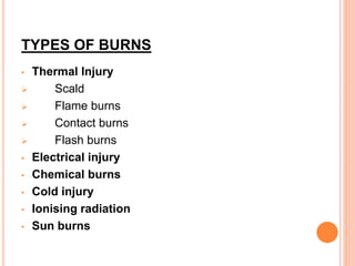 This document discusses types, classification, assessment, pathophysiology, effects, management, and complications of burns. It covers topics such as thermal, electrical, chemical, and inhalation burns. Burns are classified based on thickness of skin involvement from first to fourth degree. Assessment involves determining burn size using the Rule of Nines or Lund and Browder chart. Management consists of fluid resuscitation, wound care, surgery, and treatment of complications like infection and contractures.