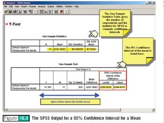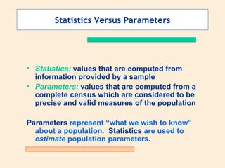 The document discusses parameter estimation and hypothesis testing. Parameter estimation involves using sample statistics to estimate population parameters and determine a confidence interval range within which the population parameter is likely to fall. Hypothesis testing uses sample statistics to determine whether to accept or reject a hypothesized statement about the population parameter. Both techniques allow researchers to generalize findings from a sample to the overall population.