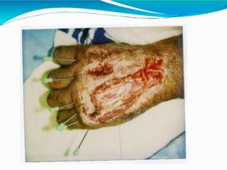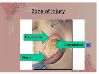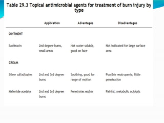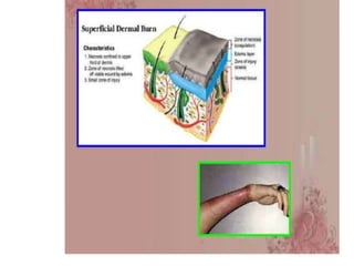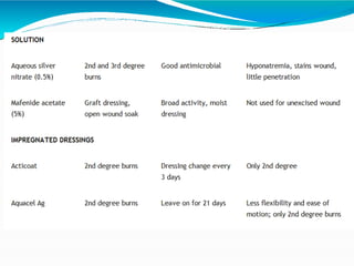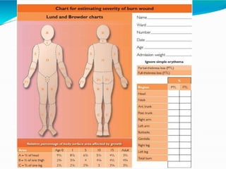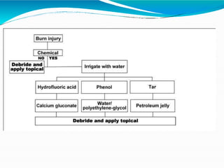 - Fluid resuscitation follows the Parkland formula to replace losses and maintain circulation. Ongoing wound care aims to prevent infection while the burns heal. Inhalation injuries require careful monitoring and pulmonary support.