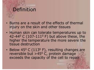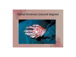 - Early management focuses on stopping the burning process, assessing airway status, estimating burn size, starting fluid resuscitation, and providing pain control. Large or full thickness burns may require inpatient care.