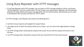Burp Repeater is a tool that allows manual manipulation and resending of HTTP and WebSocket messages to test for vulnerabilities. It displays requests and responses that can be edited and resent. Each message is opened in its own tab that contains controls to issue requests and navigate message history. Options control Repeater behavior like updating headers and following redirects. Tabs can be renamed, reordered, opened, and closed for easy management of messages.