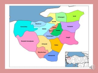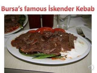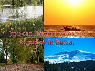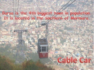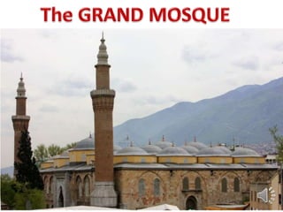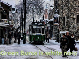 The document provides information about Bursa, Turkey. It describes Bursa as the first capital of the Ottoman State, located in the Marmara Region with a population of over 2.6 million people. Some of Bursa's notable landmarks mentioned include the Ulu Mosque built in 1396-1400, the Yeşil Mosque known for its green minarets, and the 65-meter tall Armory Clock Tower.