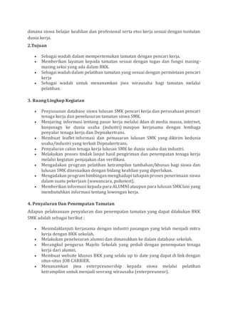 Bursa Kerja Khusus (BKK) SMK N 3 Kota Bengkulu bertindak sebagai unit pelaksana yang menyediakan informasi lowongan pekerjaan dan mempertemukan pencari kerja dengan perusahaan mitra untuk mendapatkan pekerjaan sesuai keahlian. BKK bekerja sama dengan perusahaan dan lembaga outsourcing dalam memberikan informasi kerja kepada siswa dan alumni guna meningkatkan penyerapan lulusan di dunia usaha.