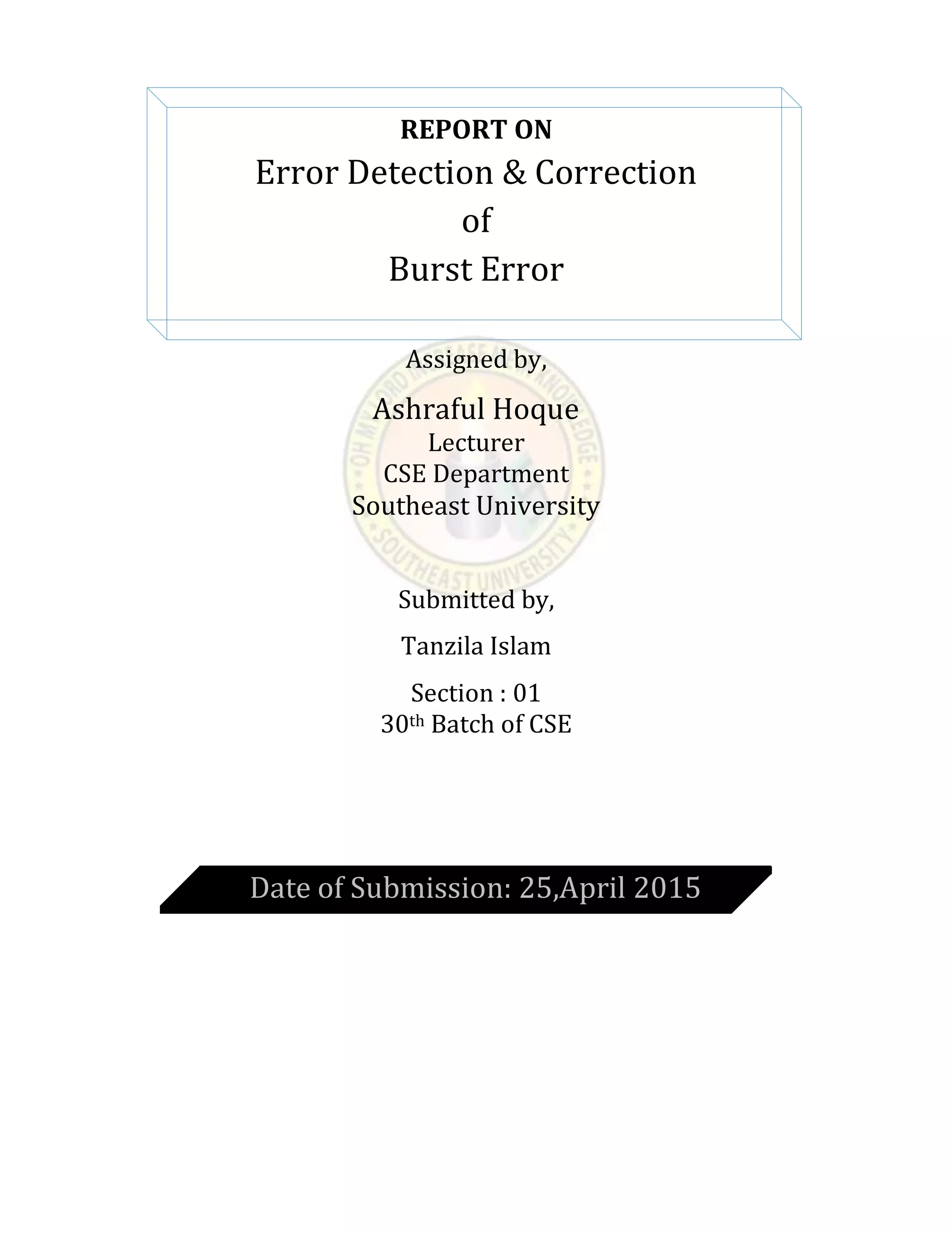 The document is a report submitted to a lecturer that discusses error detection and correction of burst errors. It first defines key concepts like Hamming codes and burst errors. It then describes how burst errors occur when multiple adjacent bits are flipped and explains how redundancy can be used to detect and correct burst errors. Specifically, it notes that linear codes can correct all burst errors of length t or less if the errors occur in distinct cosets, allowing them to be identified and corrected based on their syndrome. The report provides examples of burst errors and definitions of burst error parameters like location and pattern.