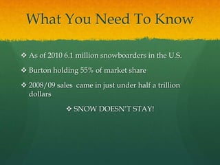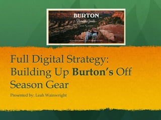 Leah Wainwright presented a digital strategy to market Burton's off-season gear to snowboarders to increase sales during the spring and summer. The plan focuses on using social media, search engine marketing/optimization, video content and a mobile app to promote Burton's summer line and get their current customers to purchase year-round. The $65k budget would be spent on paid search, social media ads, video production and a new mobile app over a 6 month period from April to August 2016. Success will be measured by sales increases on Burton's website and engagement metrics from Facebook and Google Analytics.