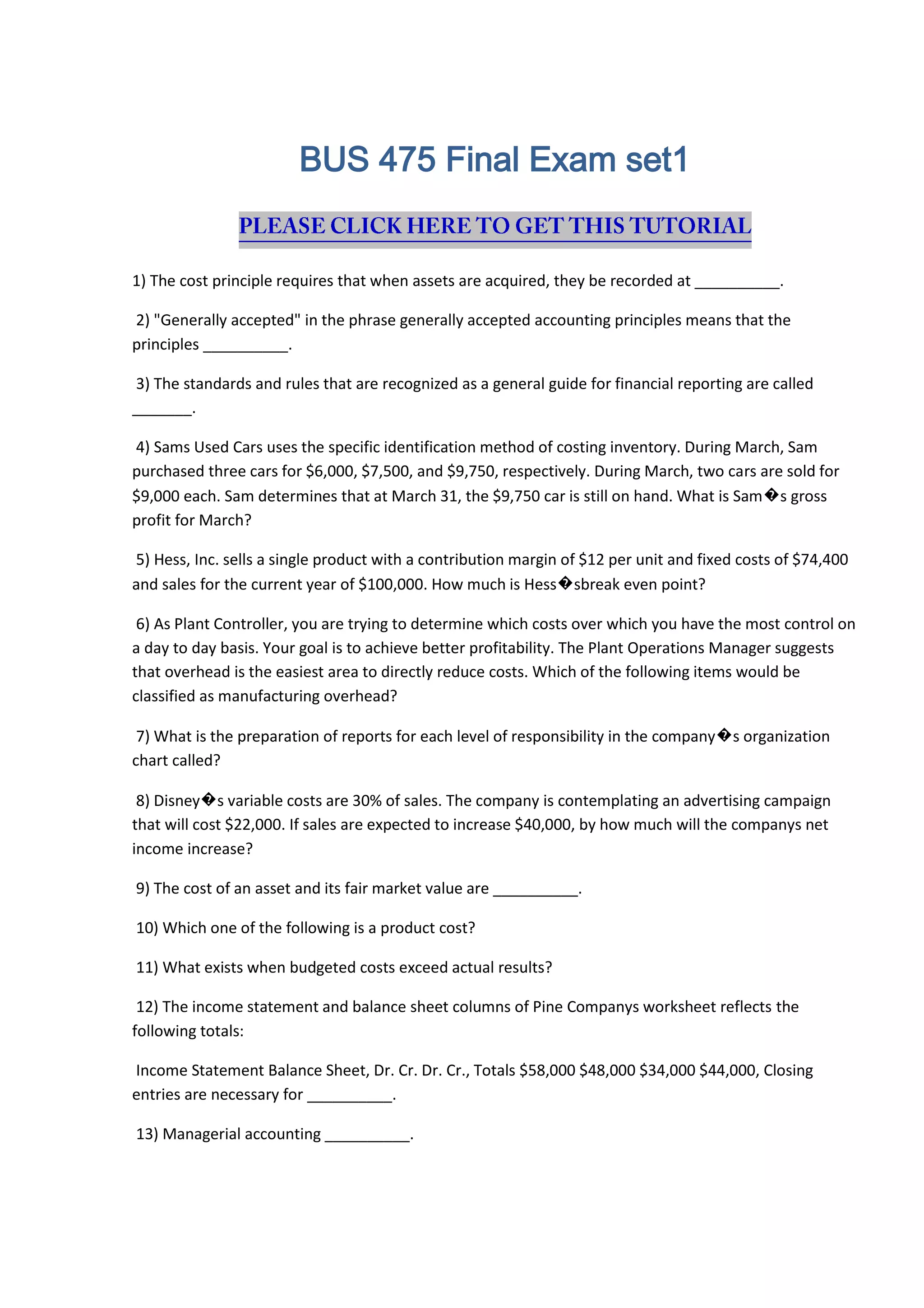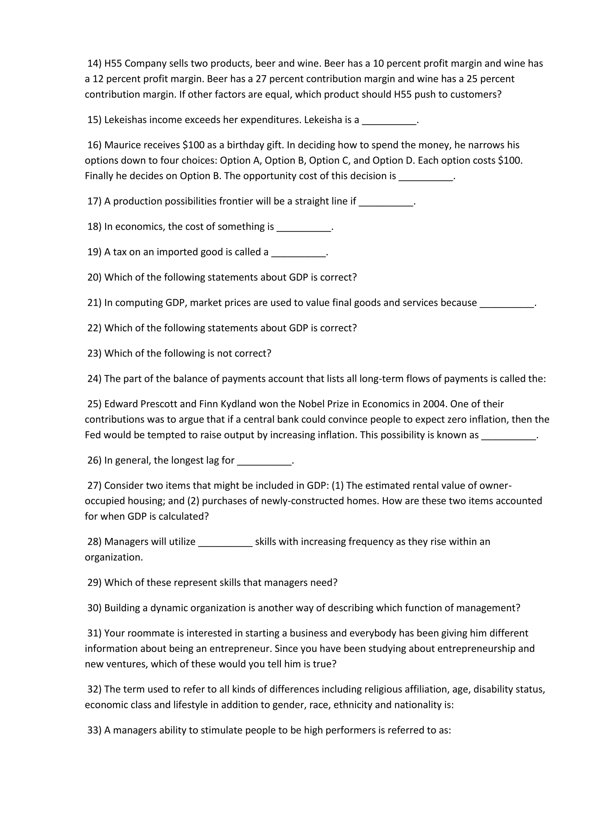 This document appears to be a set of 100 multiple choice questions covering various topics related to business, economics, management, marketing, law, and international trade. The questions assess knowledge of concepts like accounting principles, financial statements, GDP, opportunity cost, production possibilities, elasticity, management functions, quality standards, sexual harassment policies, probability, regression, and more.