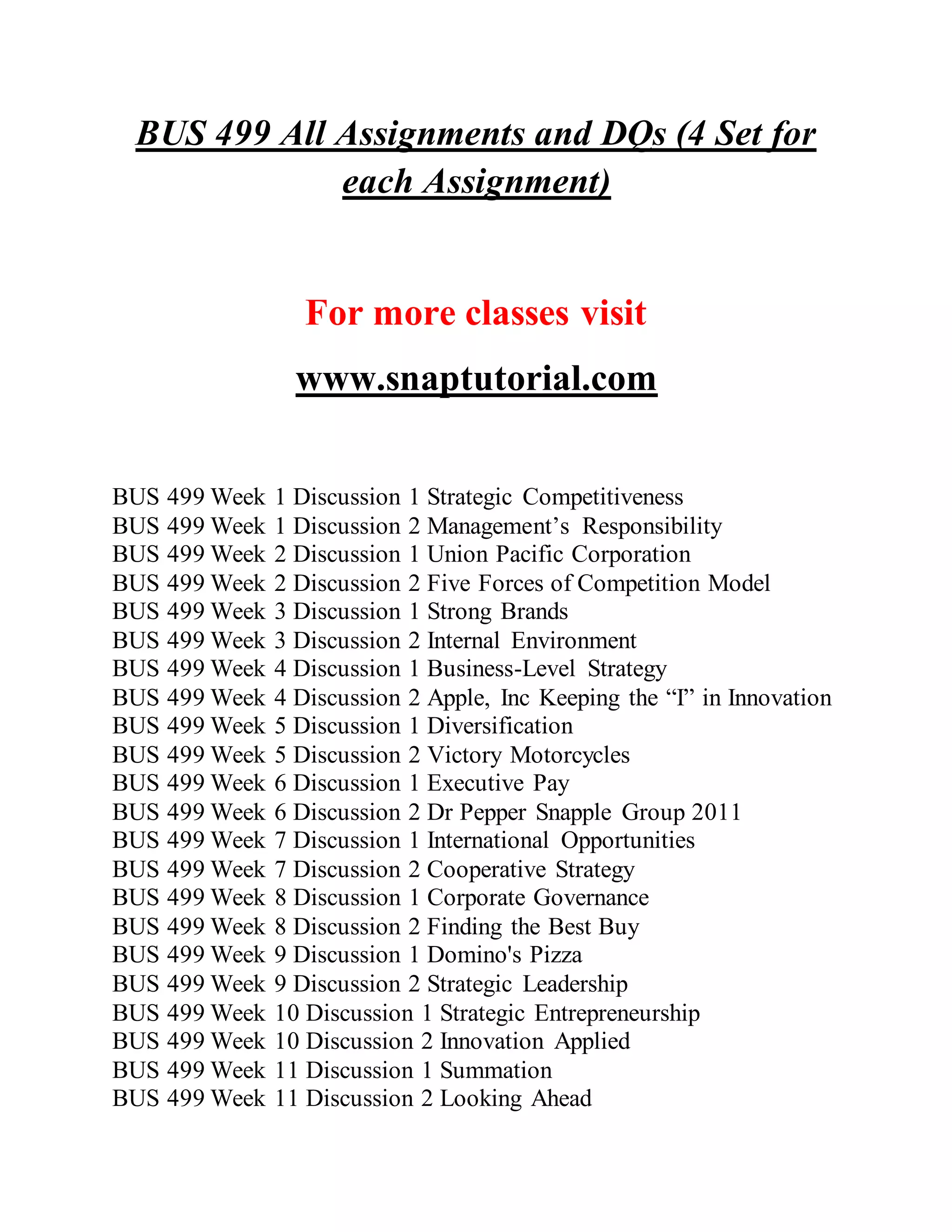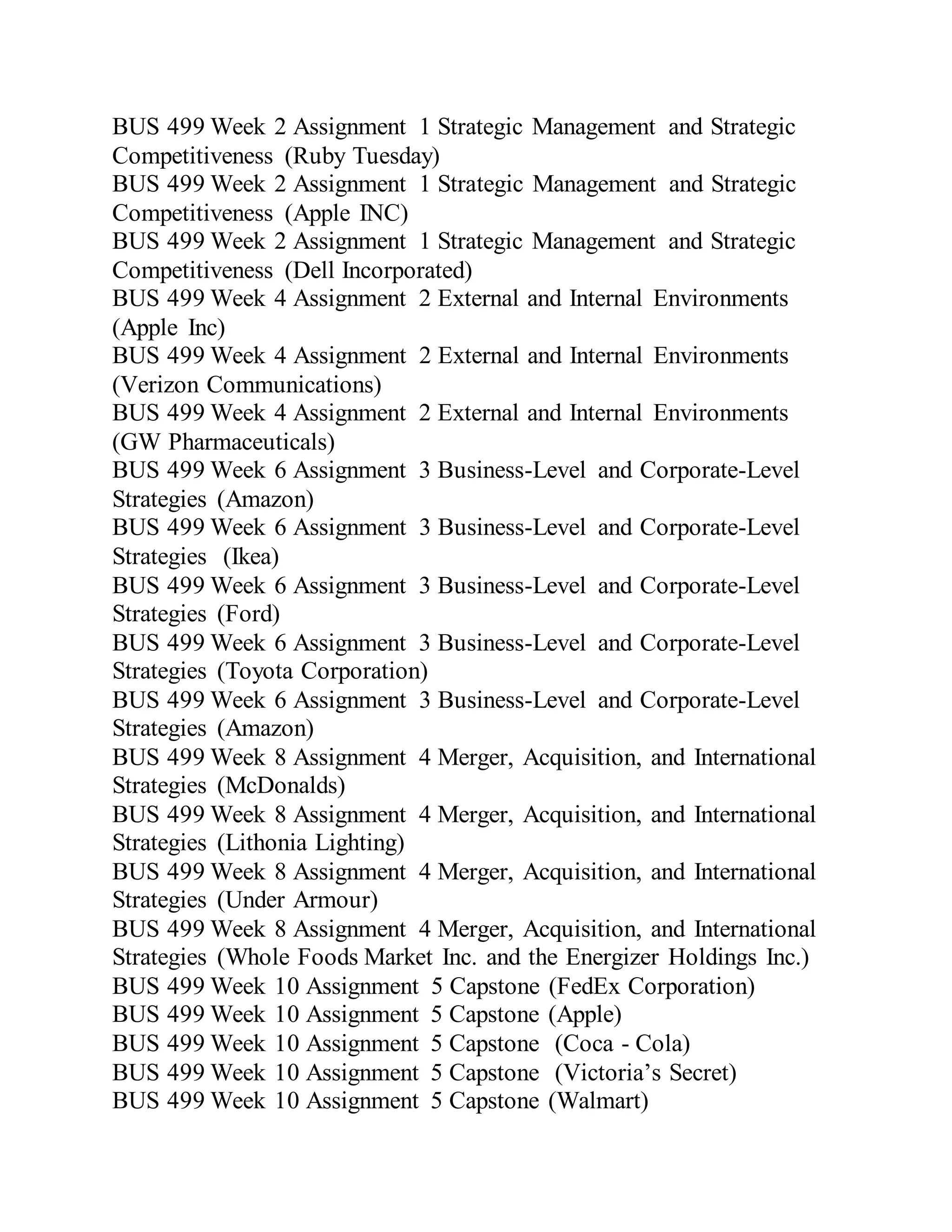 The document outlines a series of assignments and discussions associated with the BUS 499 course, covering various topics in strategic management and competitiveness. Each week includes discussions on specific companies and strategic models, alongside assignments that require research and analysis of public corporations and their external and internal environments. The assignments emphasize practical application of strategic theories to real-world scenarios while adhering to academic standards.