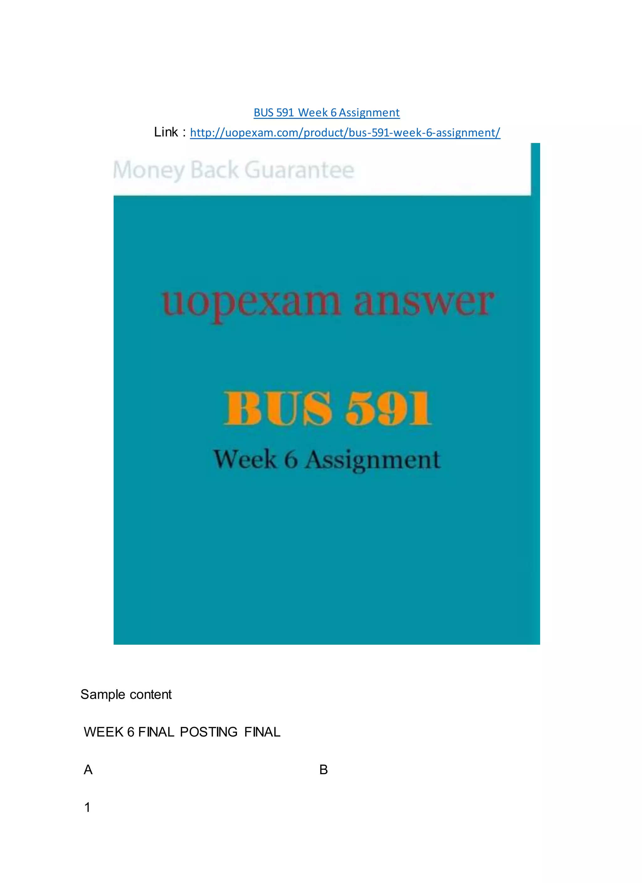 This document outlines the requirements for a week 6 assignment in the BUS 591 course, detailing tasks and templates needed for the final project. It includes guidance for various accounting practices and transactions for a hypothetical business started by a character named Natalie. The assignment is due by the end of week 6 and is worth 20 points.