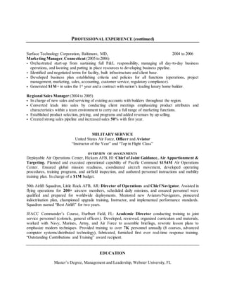 Michael P. Coulter is a business development professional and former US Air Force officer seeking new opportunities. He has over 15 years of experience in business development, operations management, sales management, and strategic planning. Coulter most recently worked as a Business Development Manager for Pro Concepts LLC, where he developed business strategies and secured new accounts. Prior to that, he held roles such as Systems Analyst and Training Specialist for Intelligent Software Solutions, and Regional Sales Manager for Infiltrator Systems and Surface Technology Corporation. Coulter has a Master's degree in Management and Leadership from Webster University and a Bachelor's degree from Troy University. He is highly decorated for his service as a US Air Force officer and aviator.
