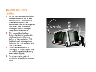 The document describes 10 innovative bus and transportation designs that aim to improve sustainability and reduce emissions. Some key points:
