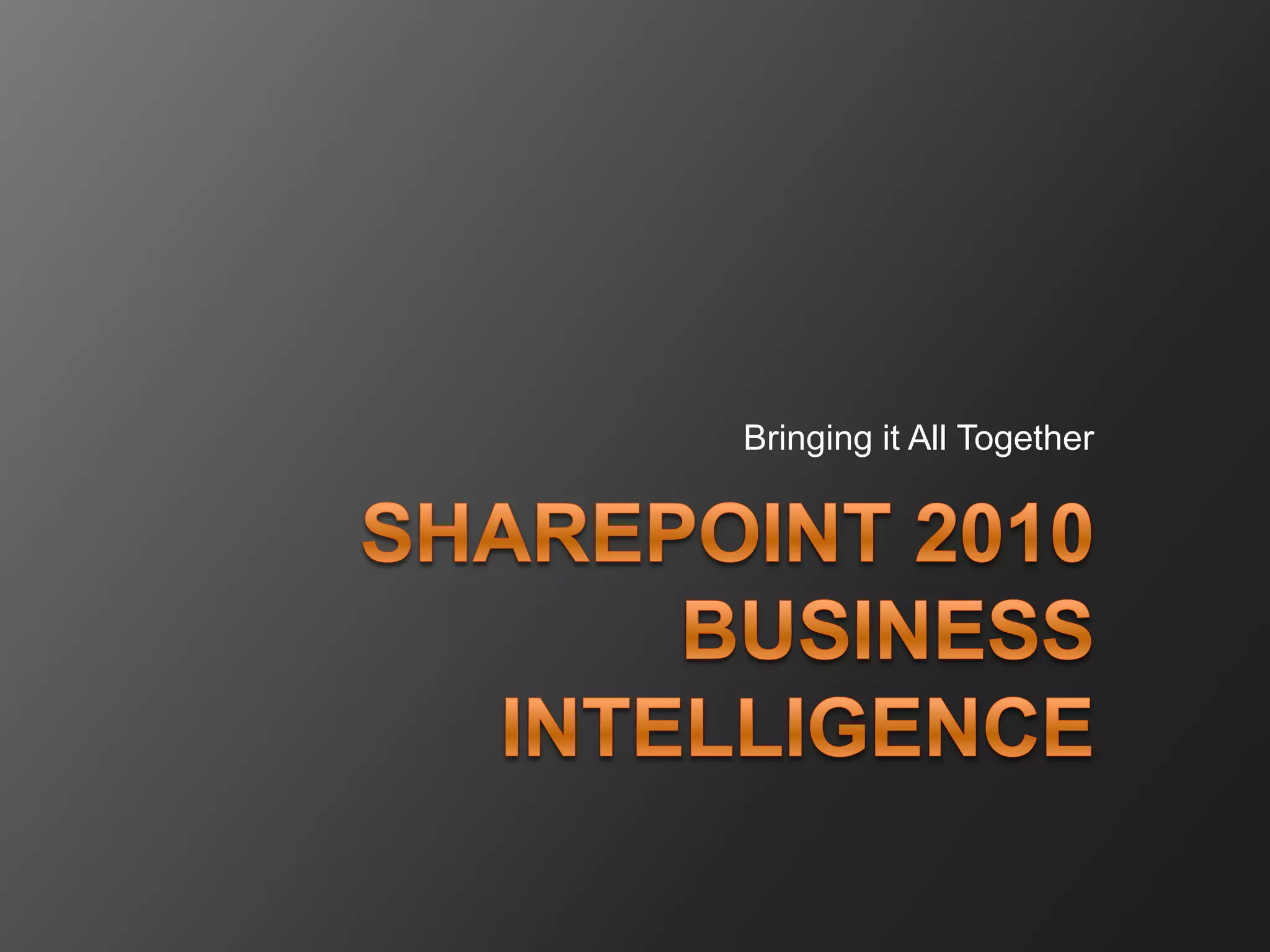 SharePoint 2010 provides a Business Intelligence platform that organizes, delivers, and uses data to make effective decisions. It has three stages: organizing data using OLAP and SSAS, delivering data through dashboards and reports, and using the data for decisions. Key components include Excel Services, PowerPivot, Reporting Services, and PerformancePoint. SharePoint 2010 BI offers advantages like low cost, customizability, and embedding with SharePoint, but requires more setup work and a fully Microsoft environment.
