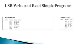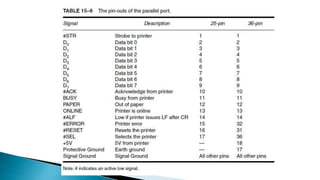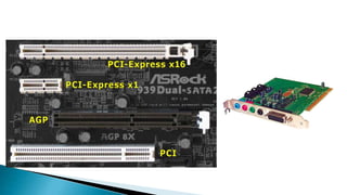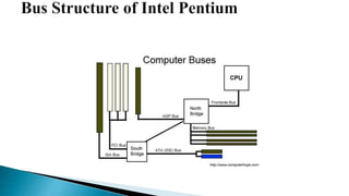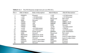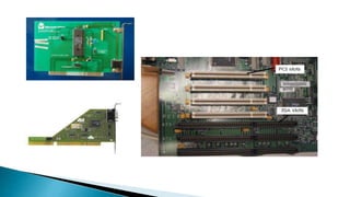 The document provides an overview of various computer bus architectures including ISA, PCI, and USB, detailing their functionalities, data transfer rates, and historical significance. It describes the evolution of these bus systems, highlighting technological advancements such as plug-and-play features in PCI and serial data transfer in PCI Express. Additionally, it addresses parallel and serial communication interfaces, discussing their configurations and operational mechanisms.