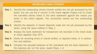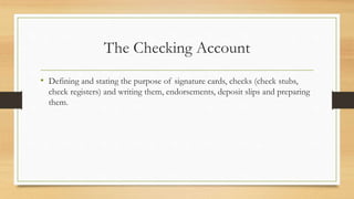 This document summarizes key aspects of banking, including checking accounts, bank statements, and trends in online banking. It discusses checking accounts, how to open a business checking account, deposit slips, and how to write and endorse checks. It also covers bank statements, the reconciliation process, and how to complete a sample bank reconciliation. Finally, it discusses trends in online banking such as increased internet usage, new banking legislation, and the role of middlemen like PayPal.
