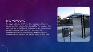 The document provides details about the play "Bus Stop" by William Inge, including the setting, characters, stages, and lighting design. The play is set in a 1950s diner in Kansas during a blizzard. It will be performed on a proscenium stage. The lighting design uses different colors, intensities and focuses to set the mood during scenes such as conversations between characters. Flood lights and spotlights will illuminate parts of the stage during acts 1-3 to draw attention to actions and enhance the drama.