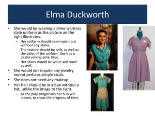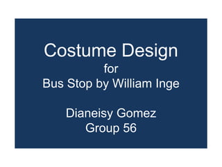 The document provides costume design suggestions for the play "Bus Stop" by William Inge. It includes descriptions of the costumes for 9 characters: Elma Duckworth, Grace Hoylard, Will Masters, Cherie, Dr. Gerald Lyman, Carl, Virgil Blessing, Bo Decker. The descriptions specify colors, fabrics, accessories, and how the costumes should reflect each character's personality and role in the play.
