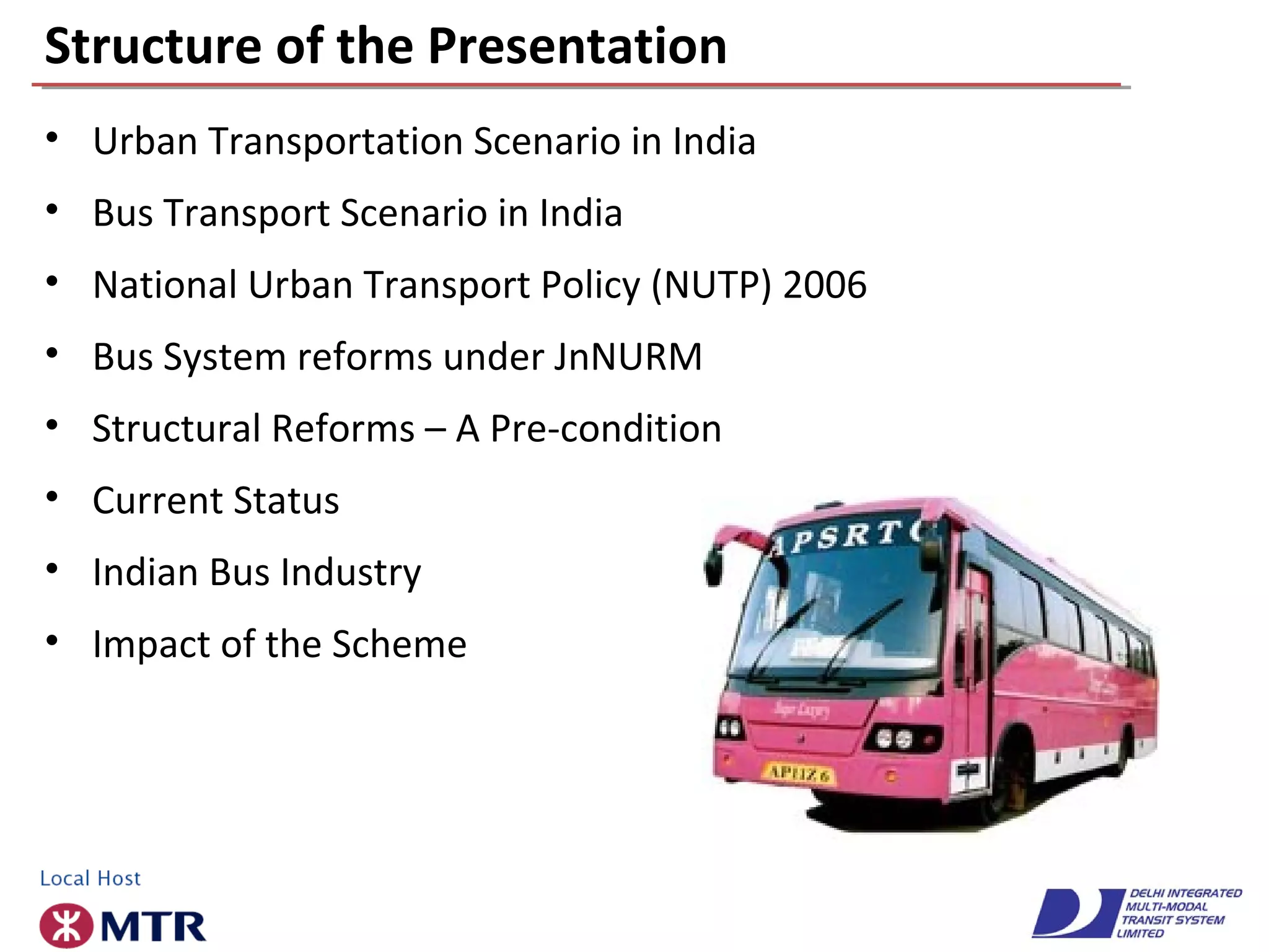 The document discusses bus system reforms in India under the Jawaharlal Nehru National Urban Renewal Mission (JNNURM), emphasizing urban transportation challenges due to rapid urbanization and population growth. It outlines the objectives of the National Urban Transport Policy (NUTP) and the JNNURM, which aims to enhance public transport systems, promote cleaner technologies, and ensure integrated planning. The reforms are set against the backdrop of increasing vehicle proliferation and the need for sustainable urban transport solutions in major Indian cities.