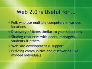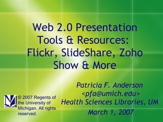 This document summarizes several Web 2.0 presentation tools including Flickr, SlideShare, and Zoho Show. It describes how Flickr can be used to find and share photos under various license types and through communities. SlideShare is outlined as a platform for sharing and discovering presentations through tags and search. Zoho Show is positioned as an online tool for creating, editing, and sharing presentations from any computer. Overall recommendations are provided for using these tools to disseminate resources, build recognition, and discover collaborators.