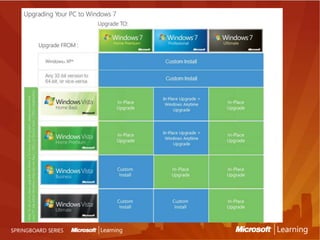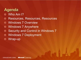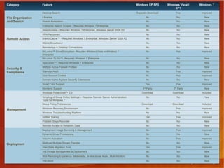 Windows 7 provides several new features to improve security, mobility, and manageability for IT professionals and end users. Key features include DirectAccess for seamless remote access, BranchCache to optimize bandwidth usage in branch offices, BitLocker and BitLocker To Go for data encryption, and AppLocker for application control. Windows 7 also includes enhancements to User Account Control, auditing, and network security to provide a more secure platform overall. These new capabilities are designed to help IT professionals securely manage mobile and distributed workforces while also improving the user experience.