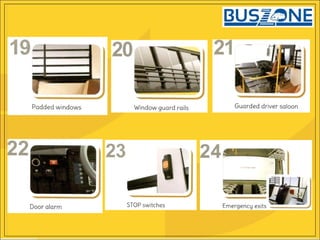 Bus Zone is a new logistics venture by Janta Group with over 5 decades of experience in logistics. Bus Zone operates an automotive transport fleet across India, including car carriers and oversized cargo transport. It services major automotive companies. Bus Zone's offerings include school bus transportation solutions, staff/contract transportation, and maxi cab services. It aims to exceed customer expectations through innovative and customized solutions built on trust.