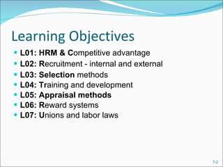 This document provides an overview of key concepts in strategic human resource management, including recruitment and selection, training and development, performance appraisal, compensation and rewards systems, unions and labor laws. It discusses internal and external recruitment sources and selection methods such as interviews and tests. It also outlines training types, performance appraisal methods, factors in designing reward systems, and how unions and laws influence HR.