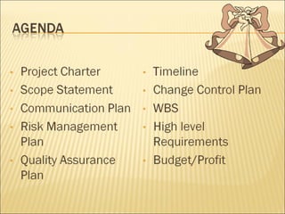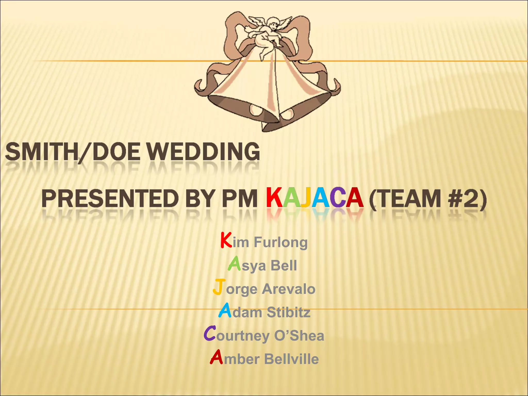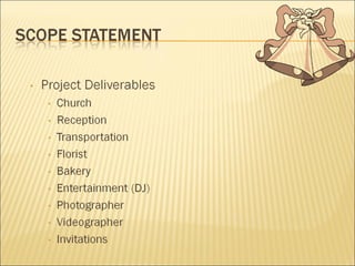 The document outlines the project plan for John and Jane's wedding scheduled for August 21, 2010. The objectives are to satisfy the needs of the father of the bride, provide high-quality and cost-effective services for 125-150 guests, and stay within a $25,000-$40,000 budget. It details the vendors contracted to provide locations, entertainment, catering, transportation, photography, flowers, bakery, and other services.