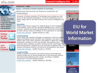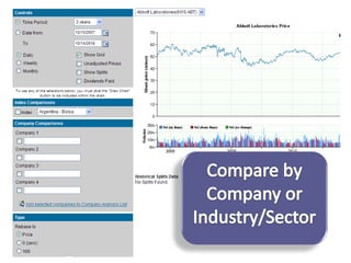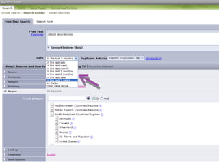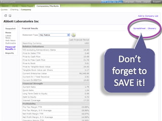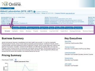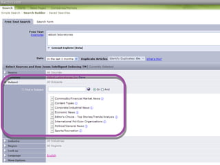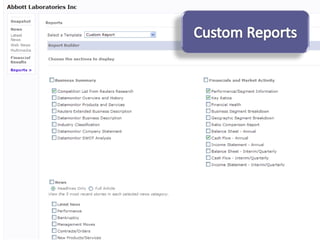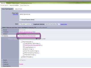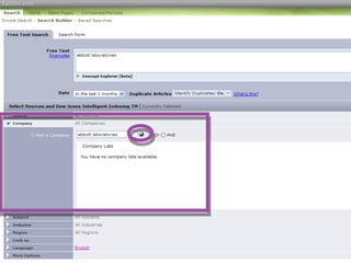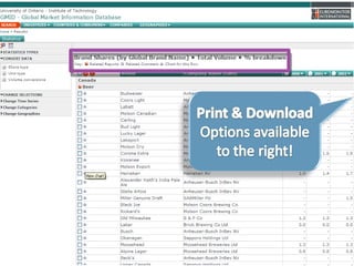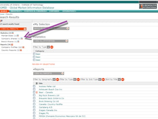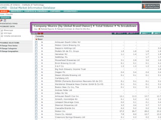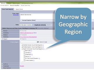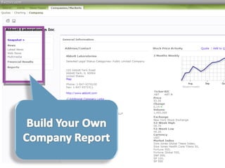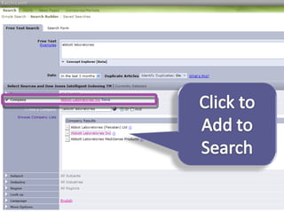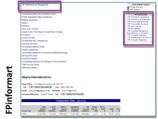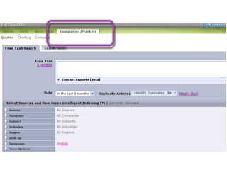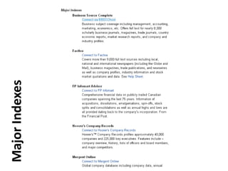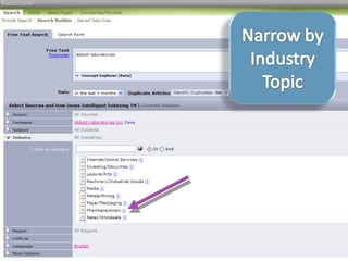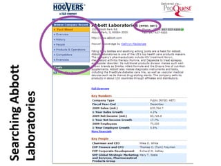 This document provides guidance on researching companies and industries. It outlines a four step process: 1) choosing a topic and scope of research, 2) accessing relevant information sources effectively, 3) analyzing and evaluating sources, and 4) presenting findings. Key information sources discussed include company websites, annual reports, databases like Hoover's, Factiva, and Mergent, as well as government sites like EDGAR and SEDAR for filings and industry sources. Tips are provided on searching techniques, evaluating source reliability and bias, and analyzing business information.