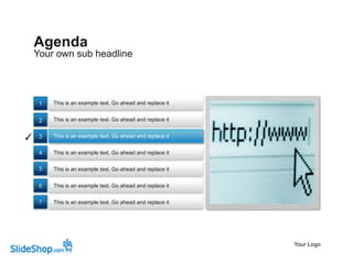 The document contains templates and examples of different types of diagrams, charts, and text blocks that can be customized with a user's own text and logo. Placeholder text and examples are provided throughout for users to replace with their own information.