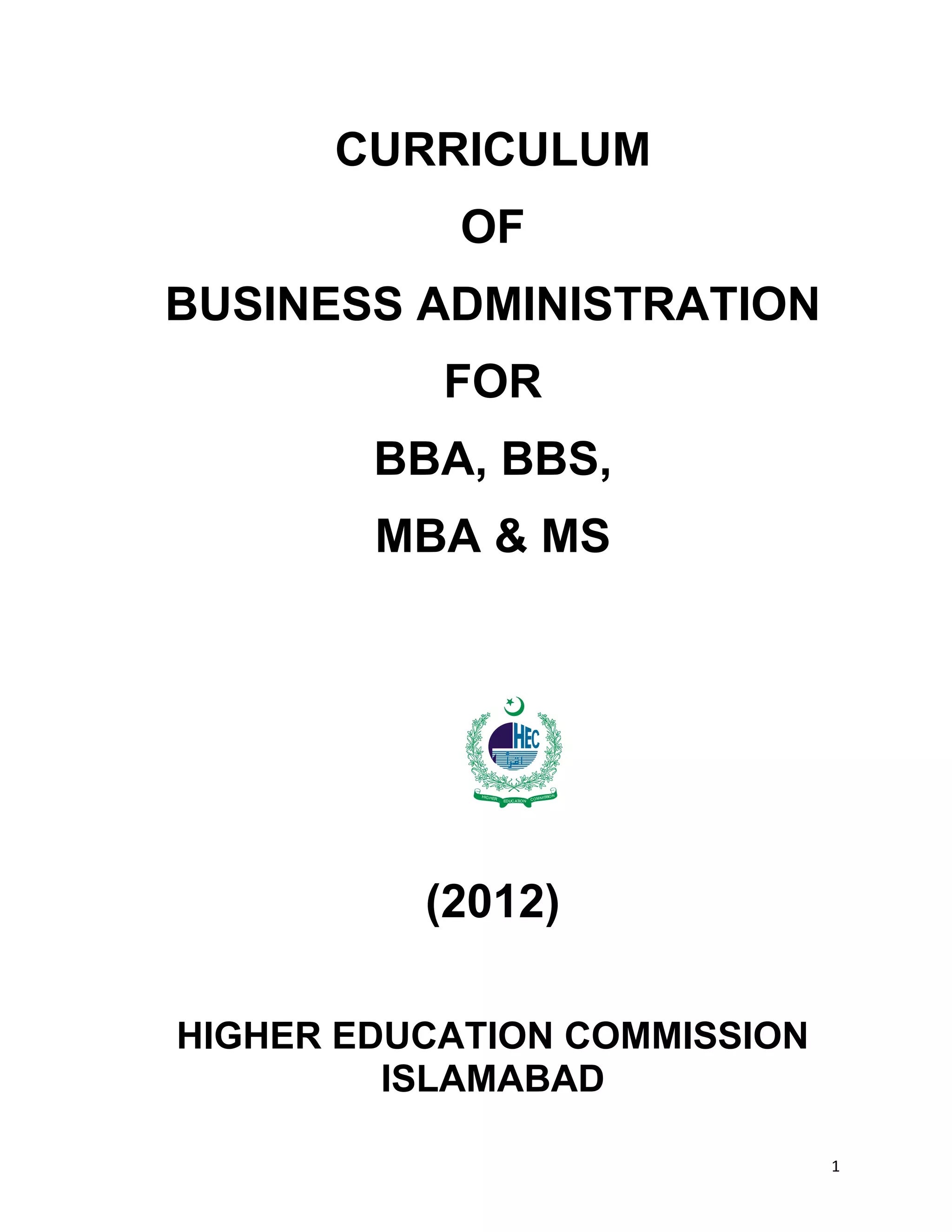 This document outlines the curriculum for Bachelor of Business Administration (BBA), Bachelor of Business Studies (BBS), Master of Business Administration (MBA), and Master of Science in Management Sciences (MS) programs in Pakistan. It provides the program objectives, structures, course outlines, and recommendations from a meeting of the National Curriculum Revision Committee on Business Administration. Key details include the objectives of the 4-year BBA program, learning outcomes, program structures and semester-wise course breakdowns for the BBA, BBS, MBA, and MS. It also lists the course outlines for compulsory, core, elective and specialization courses for each program.
