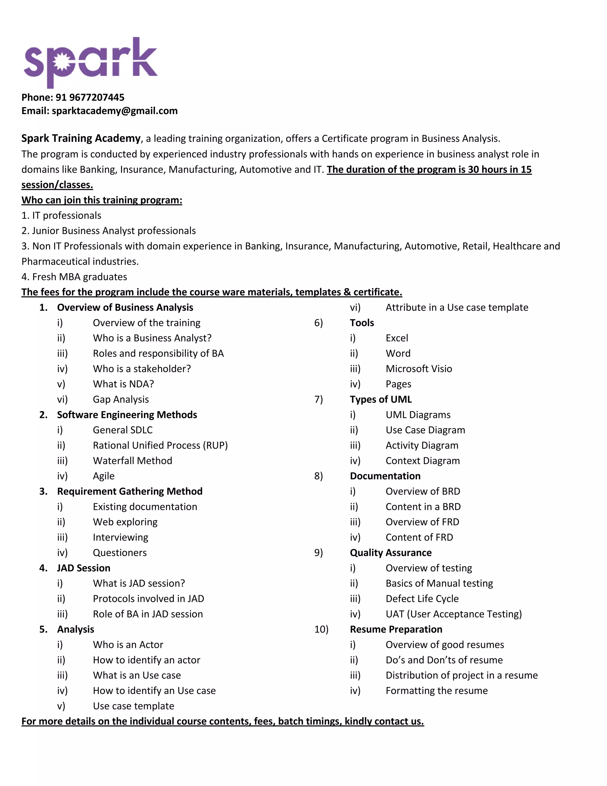 Spark Training Academy offers a 30-hour certificate program in business analysis conducted by experienced industry professionals over 15 sessions. The program covers topics like business analysis roles and responsibilities, requirement gathering, use case modeling, documentation, and testing. It is aimed at IT professionals, junior business analysts, and non-IT professionals from various domains like banking, insurance, and manufacturing. The fees include course materials, templates, and a certificate upon completion.