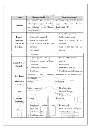 The document provides an overview of business intelligence (BI), including definitions, objectives, components, history, needs/benefits, features, uses, and examples. Some key points: