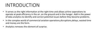 Business analytics can help the airline industry operate more efficiently by identifying potential issues before they become problems. It increases revenue by helping understand customer sentiments to increase bookings. Analytics also enables cost reductions through smart maintenance to avoid lost or damaged baggage and reduce delays. Some international airports have launched apps using big data and analytics to improve the passenger experience in real time. Benefits include better passenger experiences through personalization, boosting ancillary sales, and improved customer support. Examples of analytics include Lufthansa using VR to experience premium seating and United partnering with Amazon Alexa to manage flight experiences.
