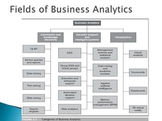 The document discusses business analytics and decision making. It defines key concepts like data warehousing, data mining, business intelligence, descriptive analytics, predictive analytics, and prescriptive analytics. It explains how these concepts are used to extract insights from data to support decision making in organizations. Examples of how different types of analytics can be applied in a retail context are provided.