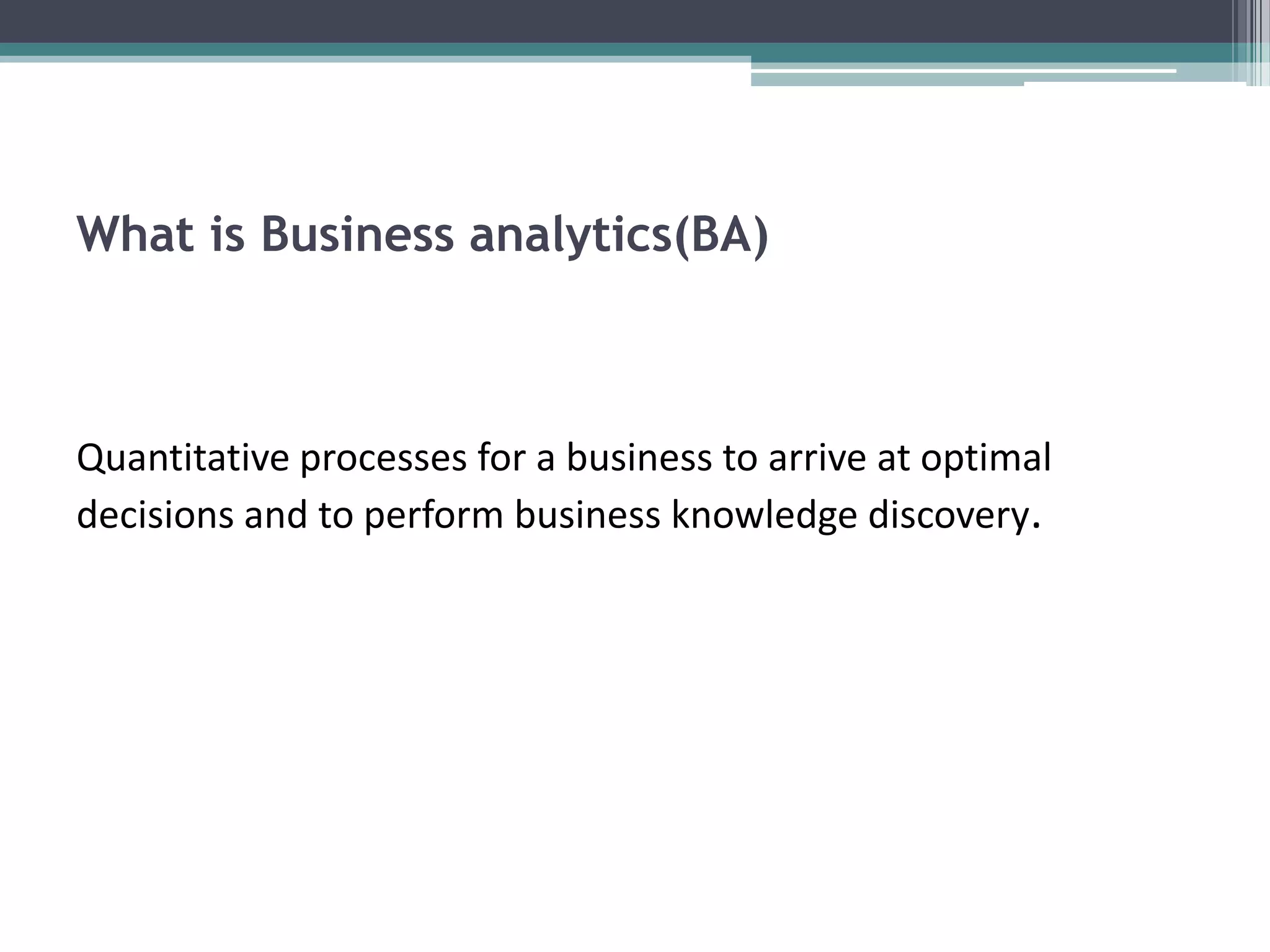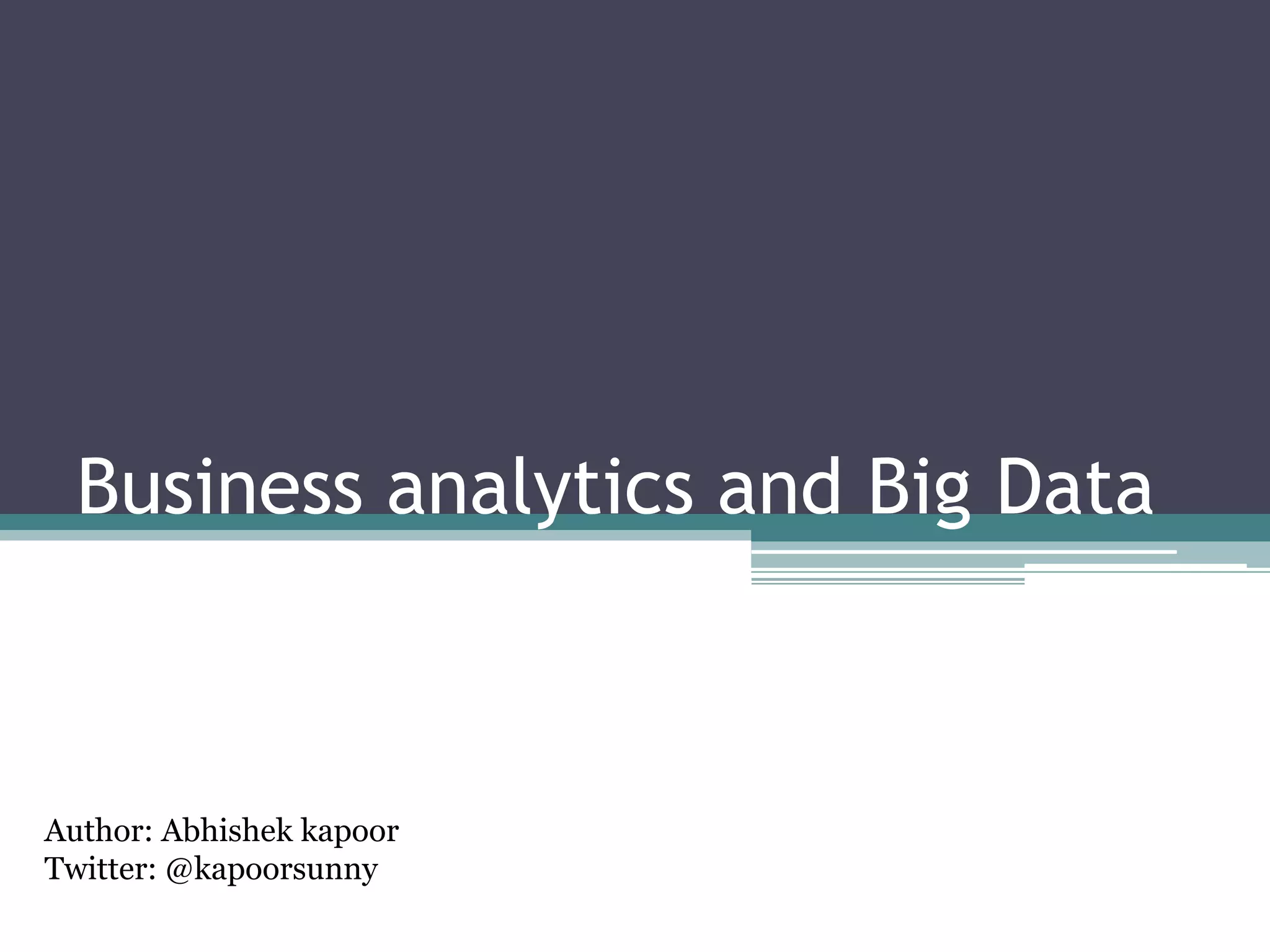 Business analytics uses quantitative processes to help businesses make optimal decisions and discover business insights from data. It includes statistics, prediction, and optimization. Big data refers to extremely large data sets that are too large to be processed with traditional data processing applications. The combination of business analytics and big data allows businesses to gain insights from large, diverse data sets to improve processes, make predictions, optimize performance, and support decision making through techniques like predictive modeling, forecasting, and response analysis. Examples include a bank using a Hadoop cluster to build a more accurate risk score to better manage customer portfolios.