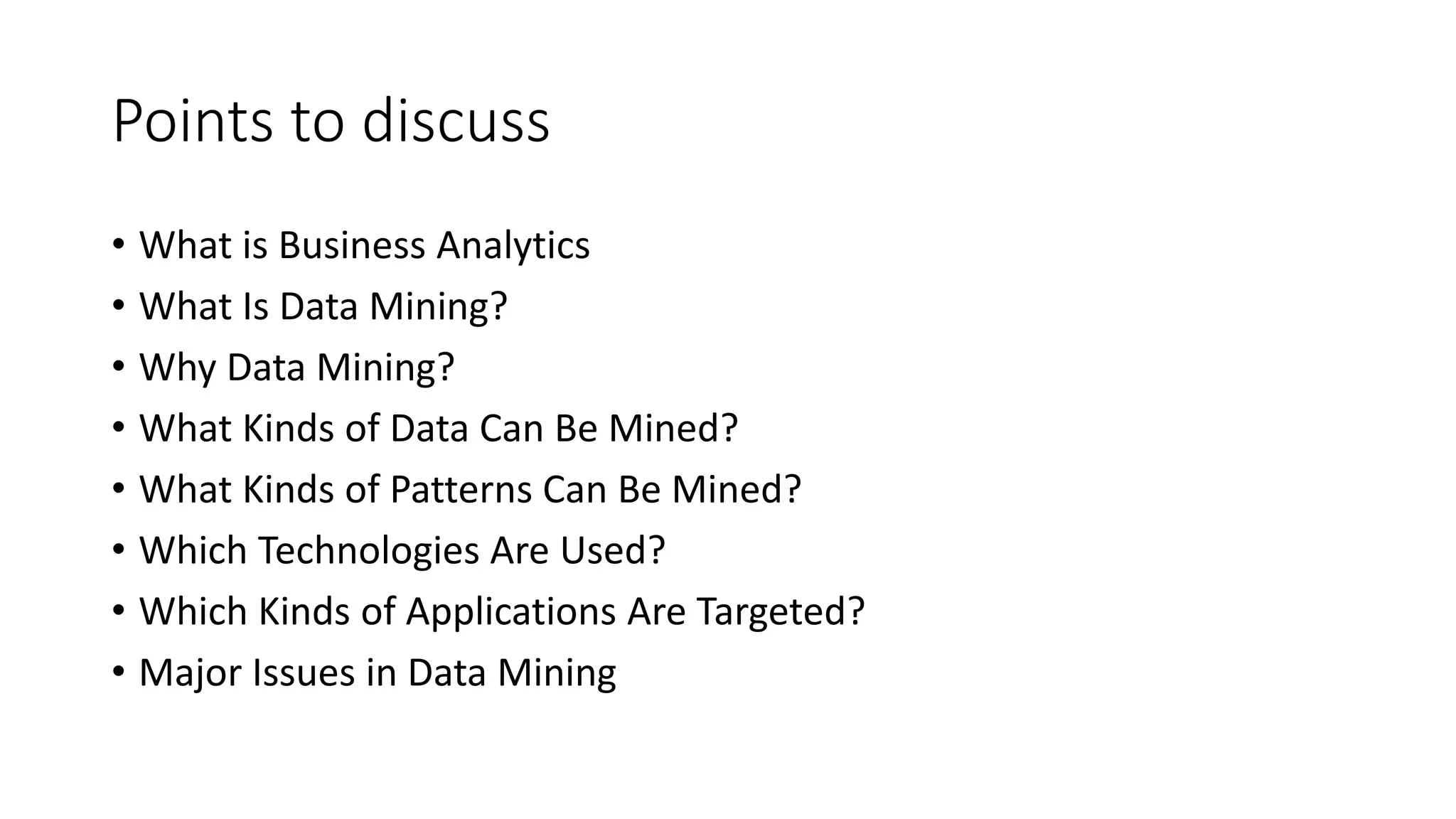 Business analytics involves analyzing large amounts of data to discover patterns and make predictions. It uses techniques like data mining, predictive analytics, and statistical analysis. The goals are to help businesses make smarter decisions, identify trends, and improve performance. Data mining is the process of automatically discovering useful patterns from large data sets. It is used to extract knowledge from vast amounts of data that would otherwise be unknown. Data mining helps businesses gain insights from their data to increase sales, improve customer retention, and enhance brand experience.