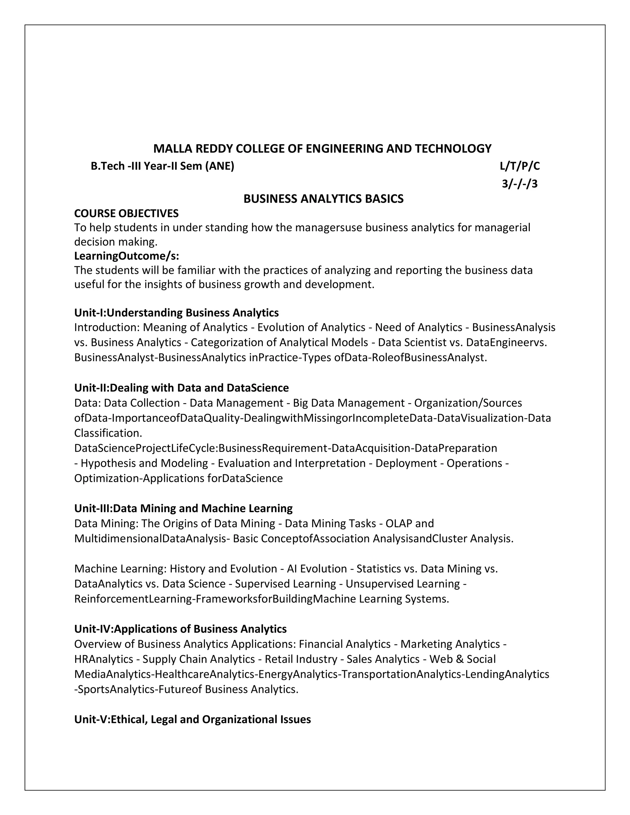 The document outlines the basics of business analytics for B.Tech students, covering its importance in managerial decision-making, data analysis, and various applications across industries. It discusses the evolution, significance, methodologies, and essential concepts of business analytics, including its different types and the distinction between business analysis and business analytics. Additionally, it highlights challenges in implementing business analytics and emphasizes its role in improving organizational performance and competitiveness.