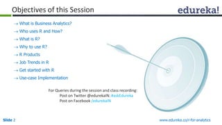 The document discusses a course on business analytics using R. It introduces R as a programming language and data analysis software used widely in business and other domains. Key topics covered in the course include an overview of business analytics, uses of R, basic R commands, data visualization in R, and examples of applying R to solve business problems like market basket analysis, churn prediction, and crime forecasting. Live demonstrations of R will also be provided.