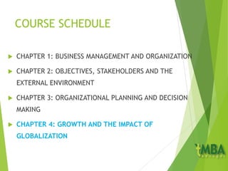 This document outlines the course schedule and content for a Business Management and Organization course. The course covers 4 chapters: 1) Business Management and Organization, 2) Objectives, Stakeholders and the External Environment, 3) Organizational Planning and Decision Making, and 4) Growth and the Impact of Globalization. Chapter 4 focuses on how businesses grow, the options for external growth through mergers or acquisitions, the reasons companies pursue globalization, managing change, and key elements to successfully managing change.