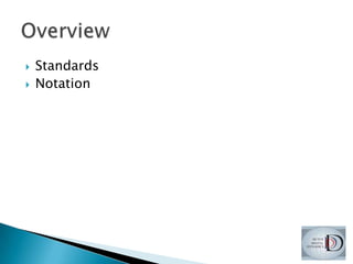 The document outlines a structured framework for business architecture, emphasizing the importance of various architectures such as Zachman and information architecture. It highlights the need for standardized notations and methods, like BPMN and UML, while advocating for a disciplined approach to analysis and design. Additionally, it discusses modeling interactions and documenting capabilities, roles, and functions within the organization.