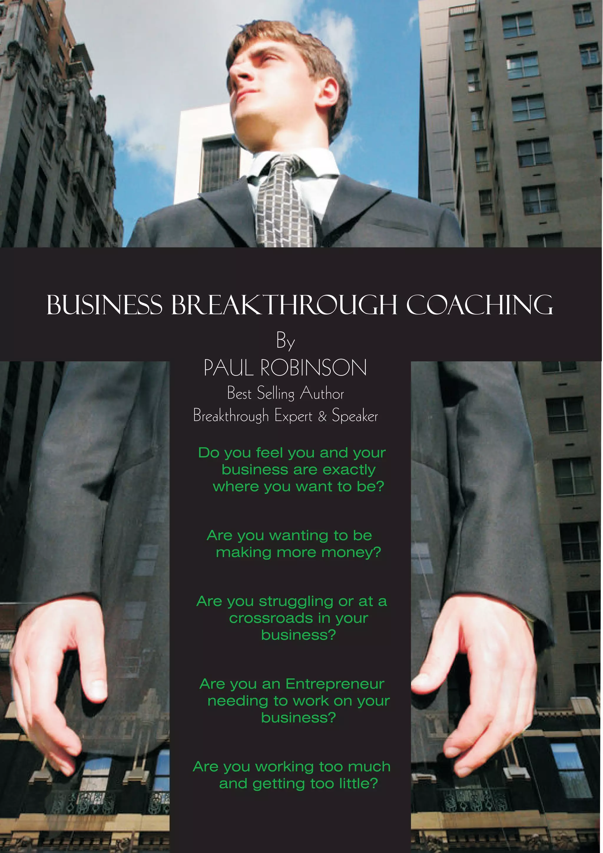 This document advertises a two-day business breakthrough coaching workshop aimed at helping struggling entrepreneurs and business owners achieve greater success and growth. The workshop will teach participants how to break through obstacles, achieve deeper visions, and become architects of their own business destiny. It will integrate principles of personal empowerment, leading business strategies, and group coaching. Attendees will learn fundamental business management skills as well as sophisticated tools for accelerating growth. The goal is to help participants design customized business plans and strategies tailored for maximum growth. The workshop is led by Paul Robinson, an author and entrepreneur who has successfully built over a dozen businesses.