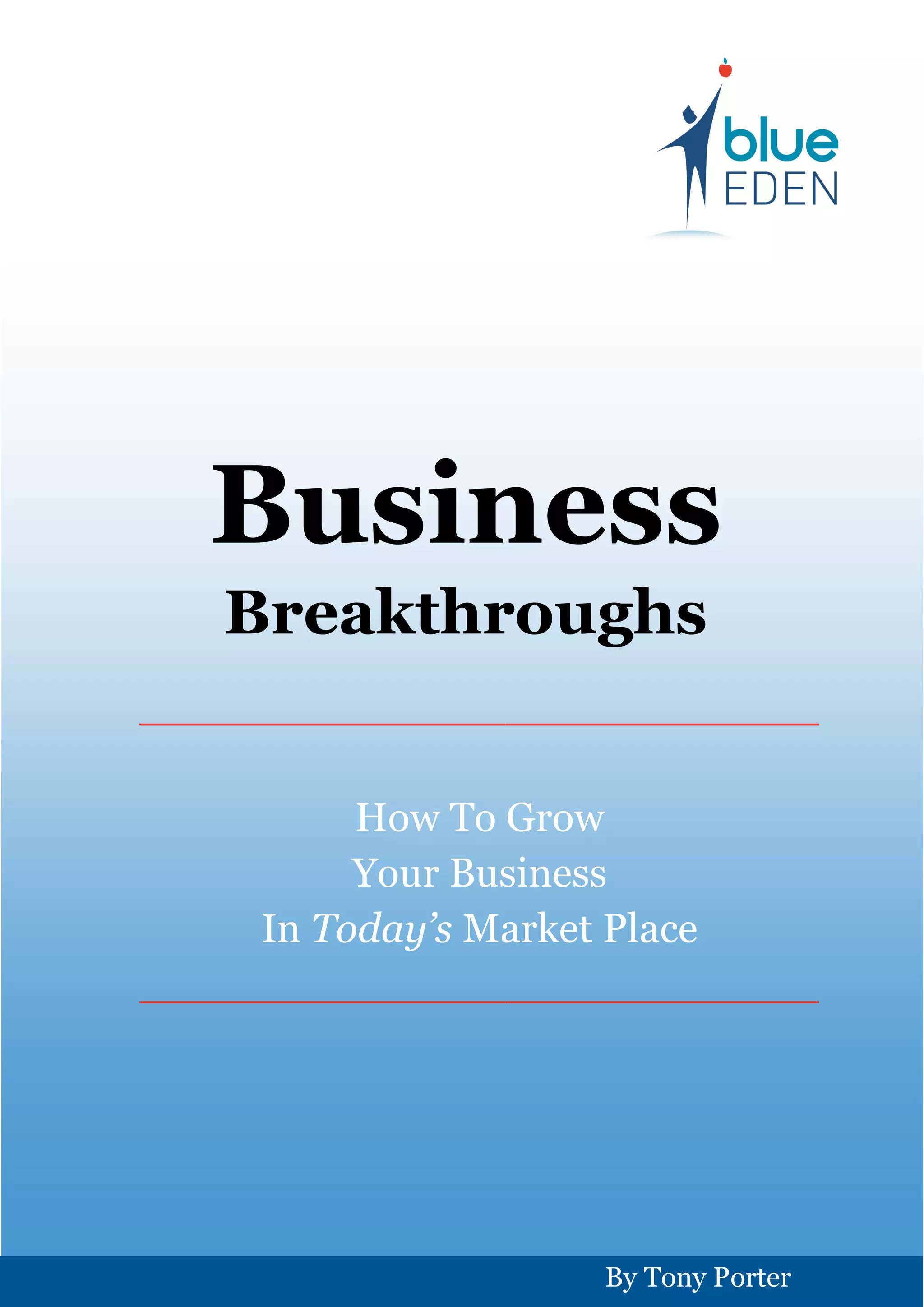 Tony Porter's 'Business Breakthrough Marketing' provides practical strategies for business owners to effectively market and grow their businesses in a shifting marketplace. It emphasizes understanding customer needs, leveraging content marketing, and focusing on three key growth strategies: acquiring more clients, increasing purchase frequency, and raising transaction sizes. The report advocates for building relationships through value-driven engagement and targeted marketing to stand out in a competitive environment.