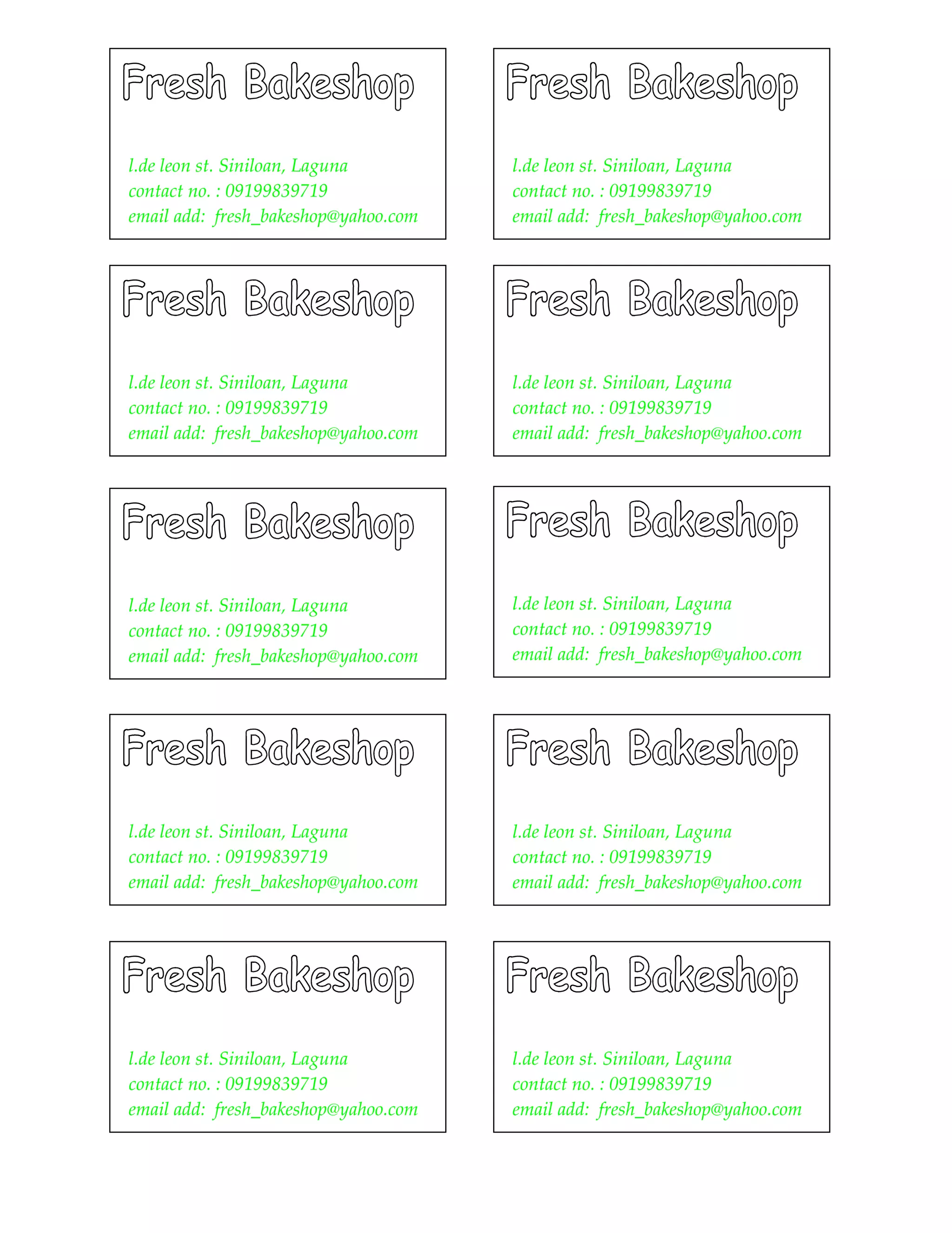 The document contains contact information for a bakery located at l.de leon st. in Siniloan, Laguna. The bakery can be reached by phone at 09199839719 or by email at fresh_bakeshop@yahoo.com. This contact information is repeated multiple times.