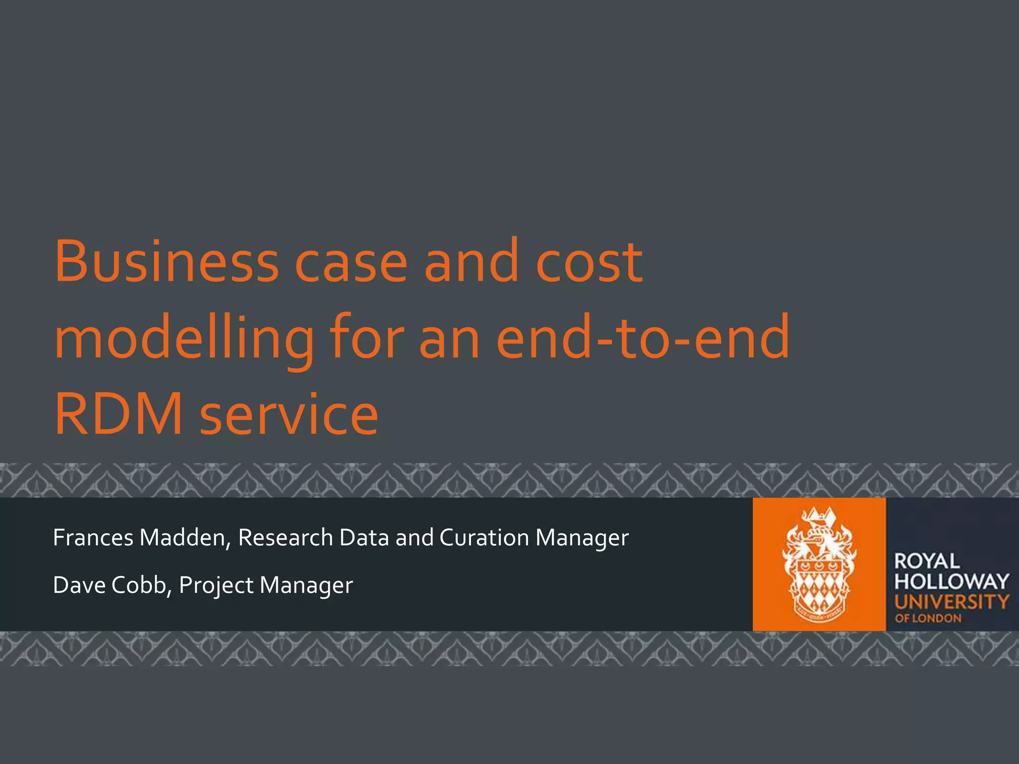 The document outlines a business case for developing an end-to-end research data management (RDM) service at Royal Holloway, University of London, emphasizing the need for improved infrastructure to support research excellence and impact. Key methodologies include user engagement and cost analysis to determine storage requirements and funding sources, alongside recommendations for implementing an active and archive storage solution by August 2016. The findings indicate a significant need for collaboration, security, and integration of services to enhance data management across the institution.