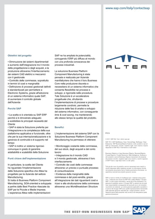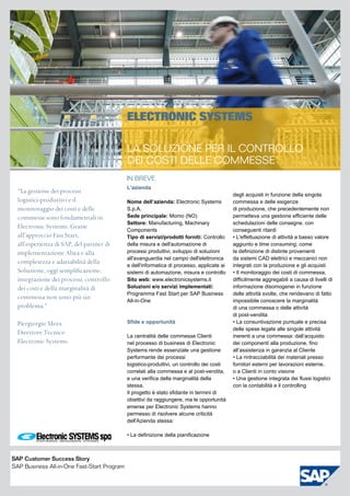 Il documento descrive come l'azienda Electronic Systems ha implementato un sistema informativo basato su SAP per migliorare il controllo dei costi delle commesse e l'efficienza delle operazioni. Grazie a questo sistema, è stata migliorata la gestione degli acquisti, la rintracciabilità dei materiali e la consuntivazione delle spese, permettendo una pianificazione più accurata e una riduzione dei ritardi. Inoltre, l'integrazione tra i sistemi CAD e gestionale ha ottimizzato i flussi produttivi e aumentato la qualità del prodotto.
