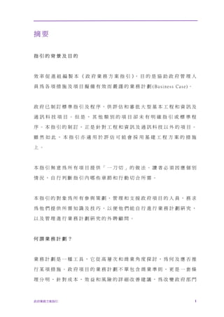 本指引旨在協助政府人員有效制定業務計劃,適用於各類項目,包括非傳統工程和資訊技術項目。業務計劃不僅提供決策依據,還能準確評估項目的成本、效益和風險。制定過程分為三個主要階段,包括需要分析、方案評估和推行計劃。